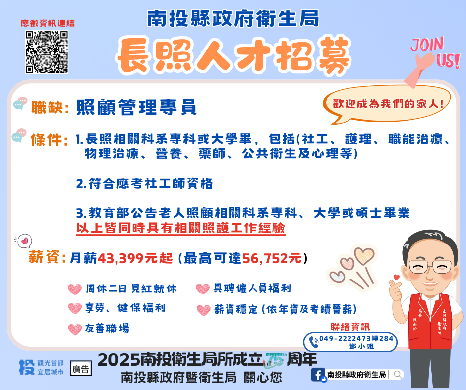 一、因應長期照護服務需求,提升照護品質,南投縣政府衛生局招募照顧管理專員。
