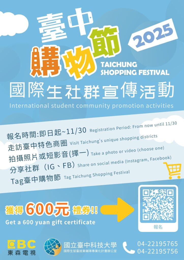 一、國立臺中科技大學「國際生留臺就業輔導專業化計畫」於114學年度與東森電視事業股份有限公司合作辦理「2025臺中購物節國際生社群宣傳活動」。