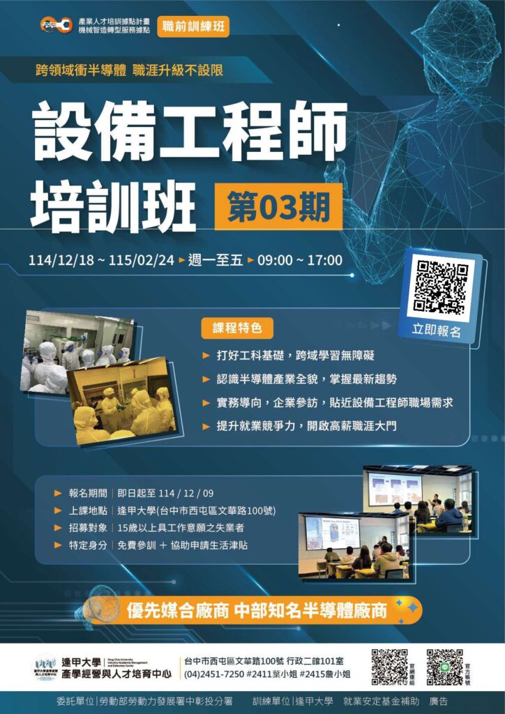 逢甲大學辦理勞動部勞動力發展署中彰投分署「113-115年產業人才培訓據點計畫(機械智造轉型服務據點)職前訓練班-設備工程師培訓班第03期」